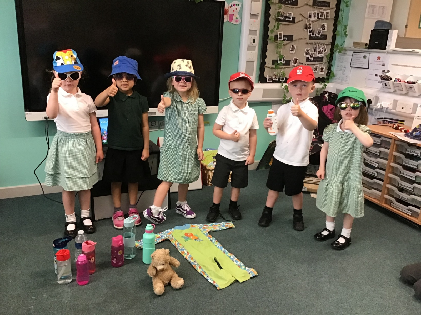 In our vehicle sessions, Nursery have been learning how to stay safe. This week we learnt how to stay safe in the sun and learnt a special phrase to help us remember – Slip, Slop, Slap. We have to Slip on a t-shirt, Slap on some suncream and Slap on a hat (and sunglasses) and then we are ready for fun in the sun. Let’s hope the soon come out soon so we can put our learning into practice!
