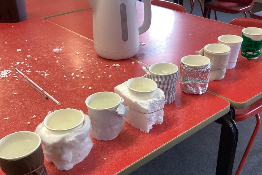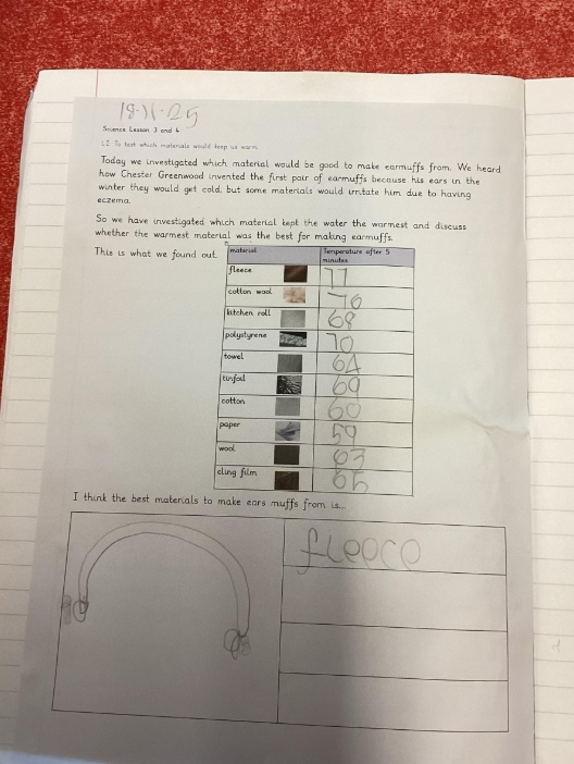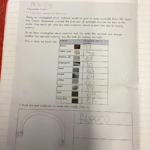 The children in Mrs O'Kane's class were busy investigating last week. They looked at which materials were good insulators in order to decide which material would make the best earmuffs. The children also learnt how to use a thermometer to measure temperature and used this knowledge to support their investigation.